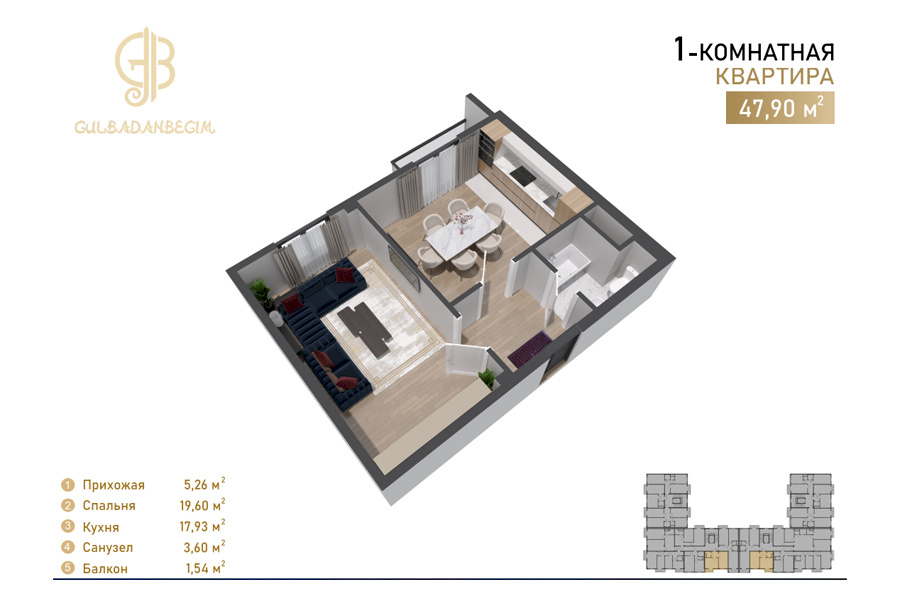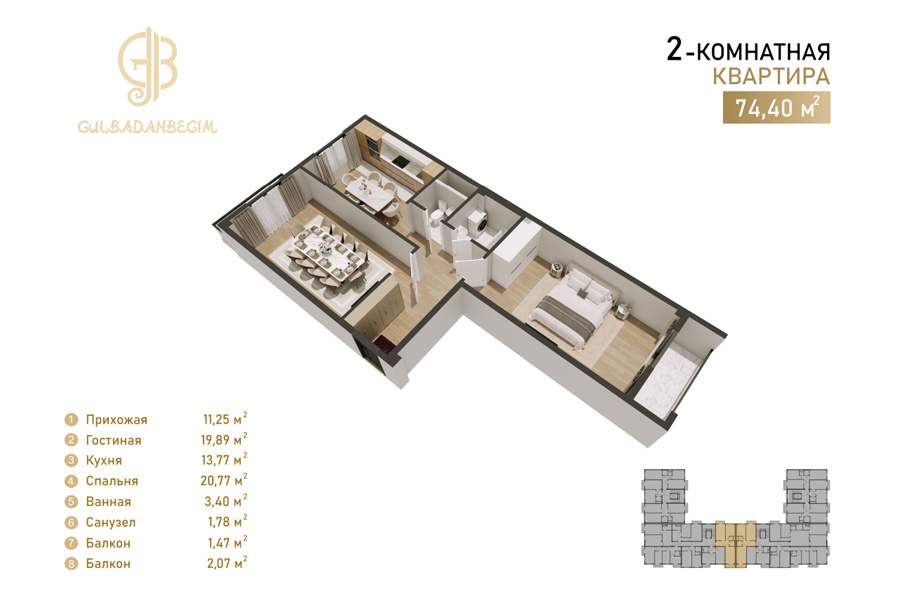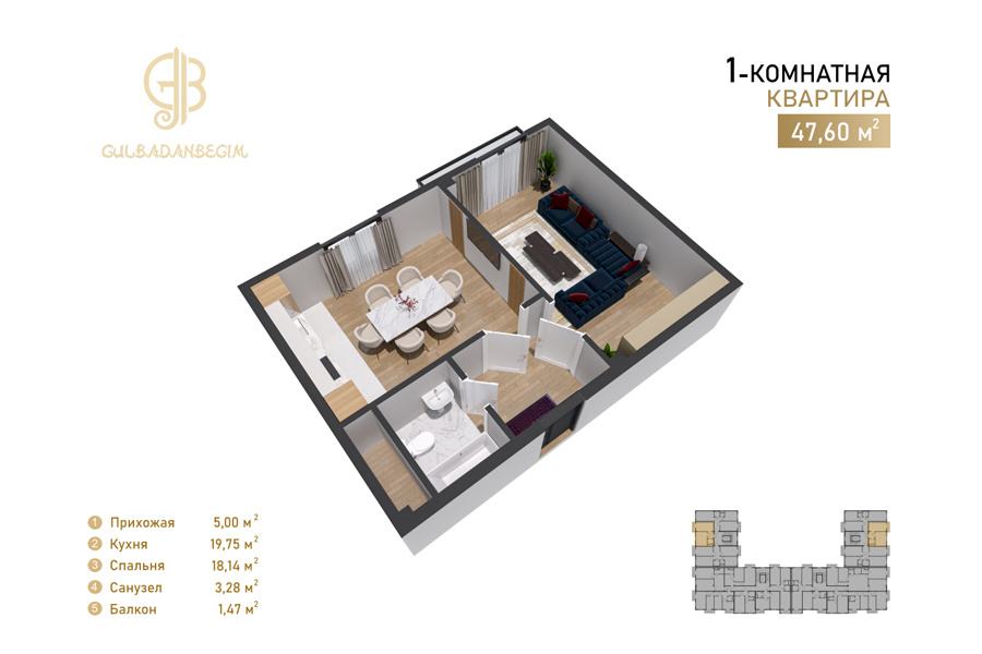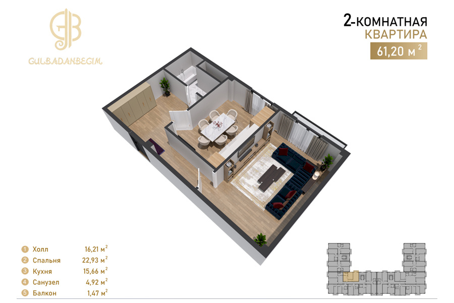 Жилой комплекс Gulbadanbegim — это современная новостройка комфорт-класса, расположенная в Мирзо-Улугбекском районе Ташкента по улице Гульбаданбегим, 47. Проект представляет собой стильное 7-этажное монолитное здание с прочной сейсмостойкой конструкцией и светлой аккуратной отделкой фасада. Строительством занимается компания KMM Development, предлагающая квартиры с чистовой отделкой и полностью готовыми коммуникациями.