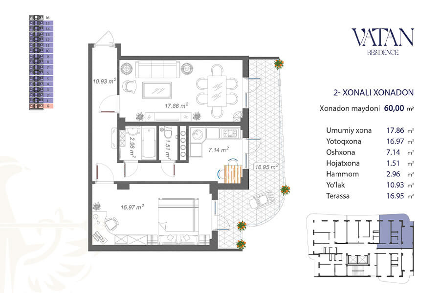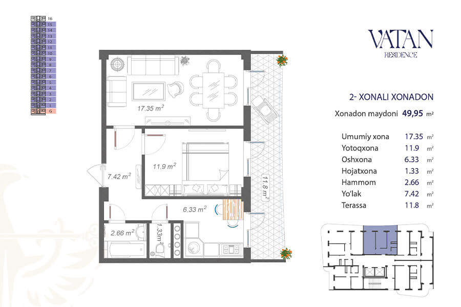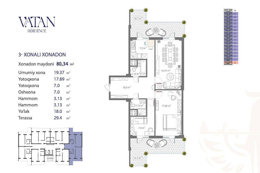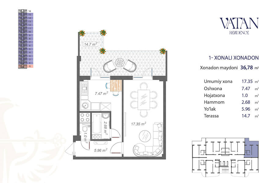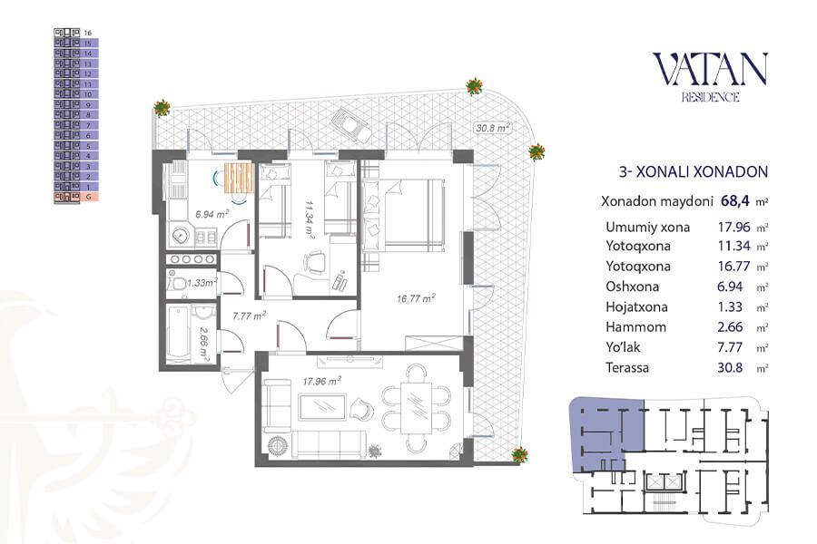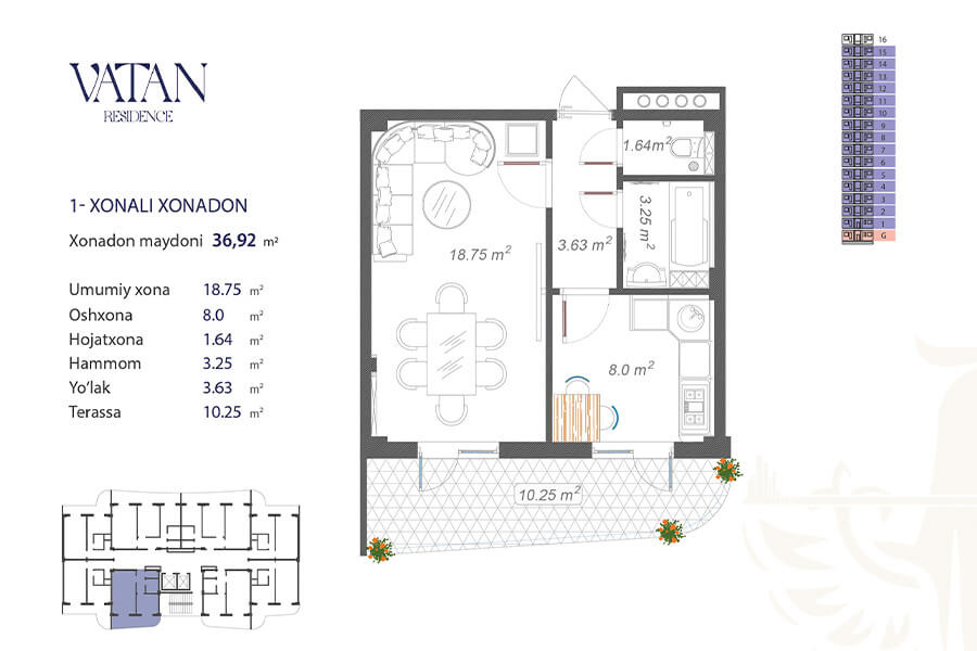 Жилой комплекс Vatan – это целый, современный микрорайон, расположенный на территории 70.000 квадратных метров. В комплекс входит тринадцать 16-этажных корпусов. Квартиры представлены с черновой отделкой. Для жильцов с личными автомобилями предусмотрена наземная и подземная площадки.