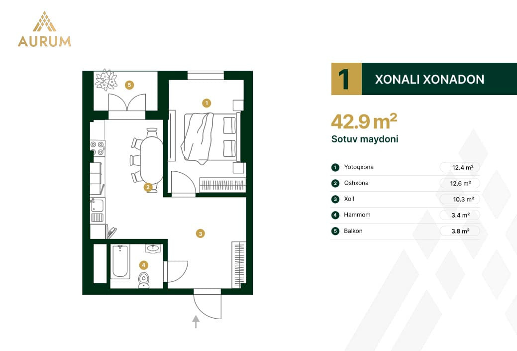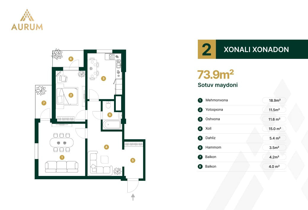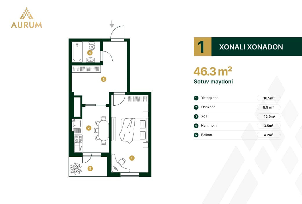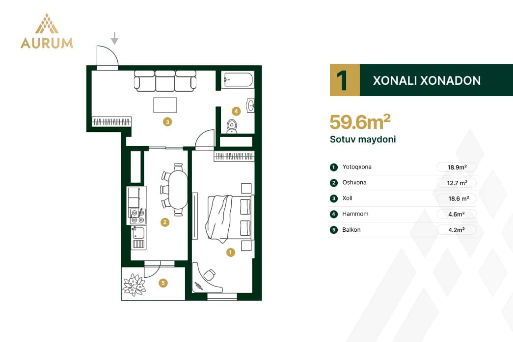 Aurumda 1, 2 va 3 xonali turar-joylar taklif etiladi. Maydonlari taxminan 43 m² dan 75 m² gacha bo‘lib, keng va yorug‘ interyer yaratishga imkon beradi. Uylar 12 qavatli bloklardan iborat, baland shiftlar esa xonalarni yanada keng his qiladi. Qurilishda monolit konstruksiya va sifatli materiallar qo‘llanilgan — issiqlik, shovqin izolyatsiyasi va mustahkamlik yuqori darajada.