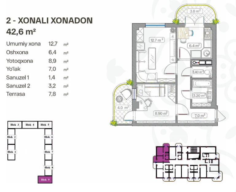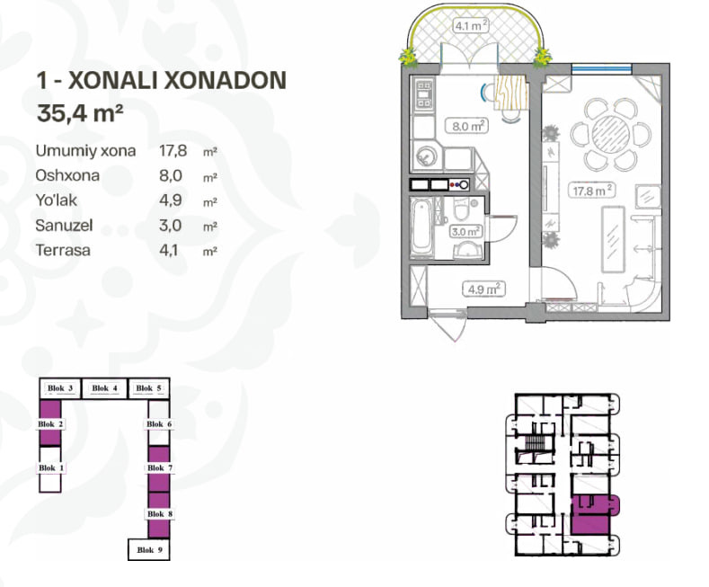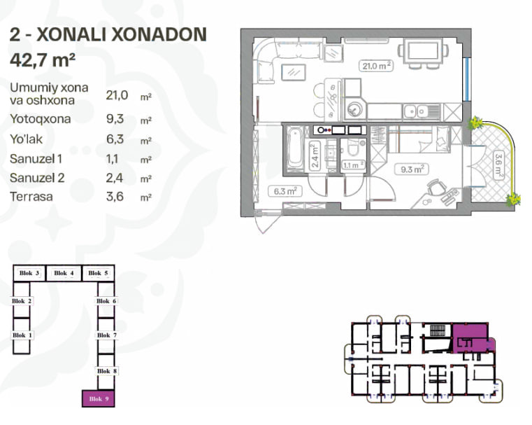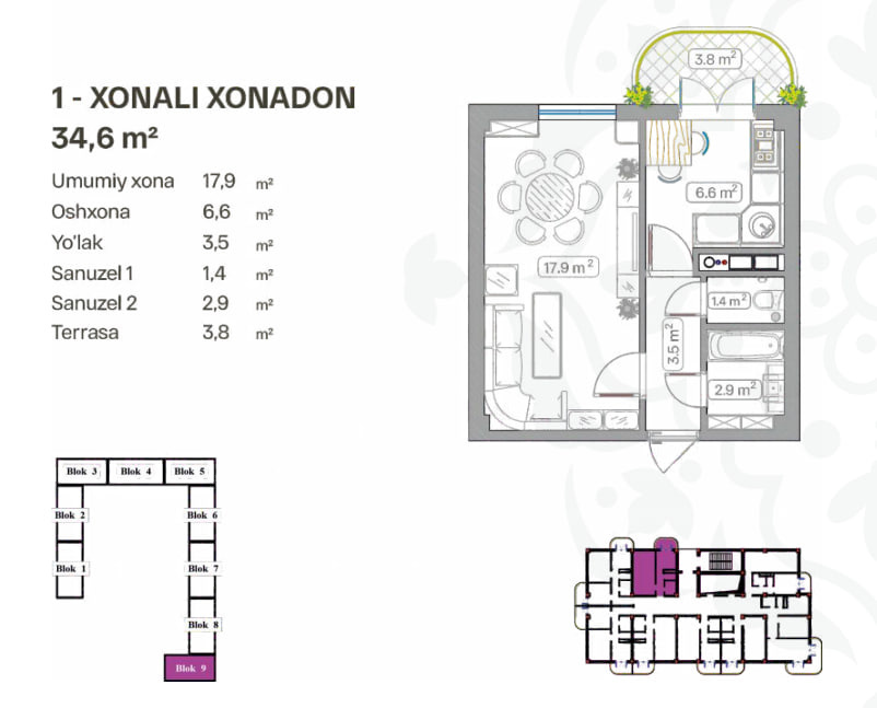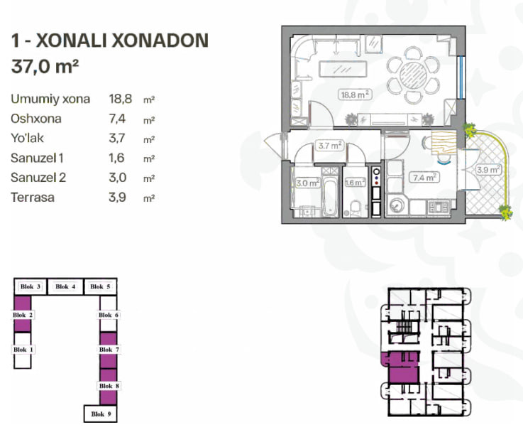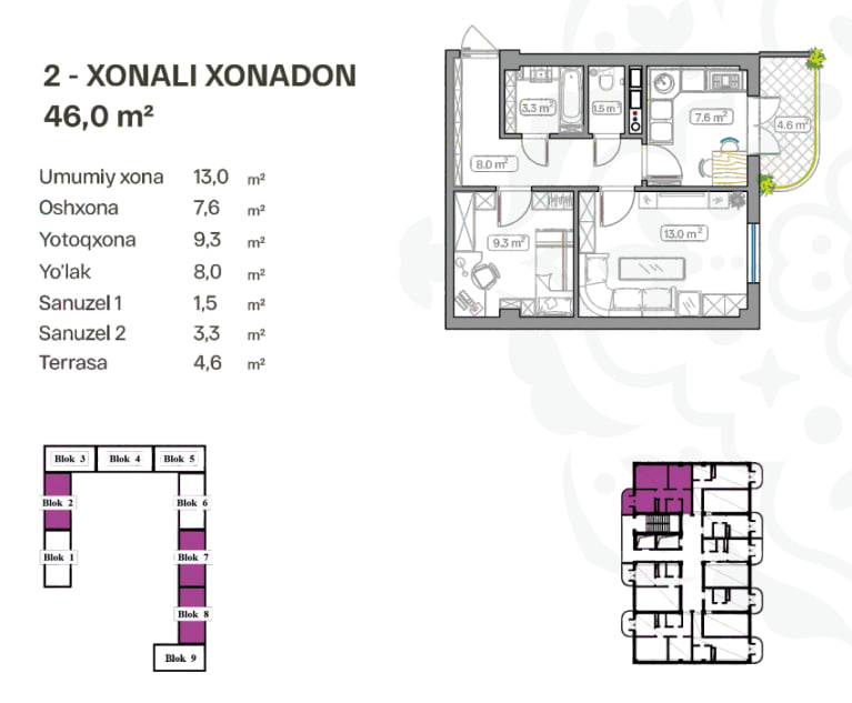 Majmuada shift balandligi 3 metr bo‘lgan 1, 2 va 3 xonali xonadonlar mavjud. Har bir xonadon balkon bilan jihozlangan. Quruvchi uy-joyni ijaraga berishda kadastr hujjatlarini taqdim etadi.