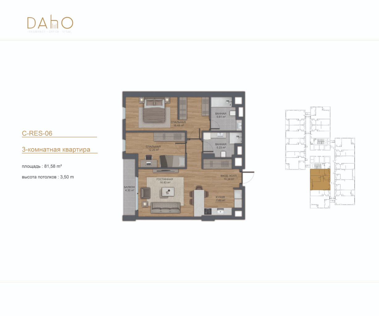 Daho является проектом формата Mixed-Use который располагается в самом сердце Ташкента на пересечении двух улиц Тараса Шевченко и Саида Барака. Общая территория проекта составляет 1,6 гектаров где будут располагаться 6 блоков концепция которой двор без машин. Три блока предназначены под БЦ, 2 жилых блока и Гастрономия. На первых этажах каждого блока будут функционировать помещения под стрит ритейл. Предусмотрен 2 этажный подземный паркинг на 761 машиномест. Также из преимуществ, в проекте будет располагаться 2х этажный фитнес центр, крытый бассейн, коворкинг зона, бутики, кофейни, и рестораны.