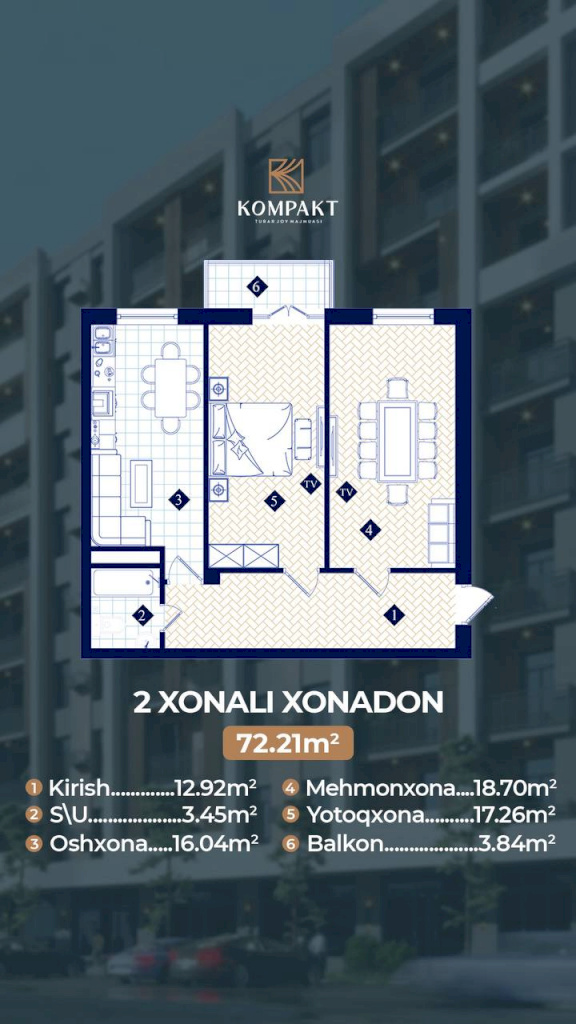 "Kompakt House" turar joy majmuasi qulaylik, estetika va amaliylikni qadrlaydiganlarning tanlovidir. Bu shunchaki kvadrat metrlar emas, balki hayot, ilhom va xotirjamlik uchun puxta o‘ylangan makon.