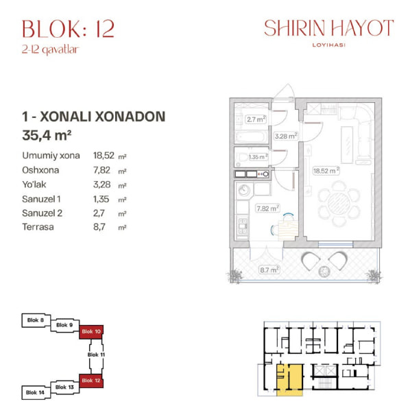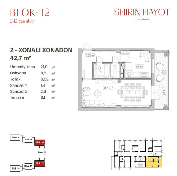 Majmuada turli tarkibdagi oilalar uchun mo‘ljallangan turli variantdagi xonadonlar mavjud. Xonadonlar zamonaviy qulaylik va funksionallik talablarini hisobga olgan holda loyihalashtirilgan.