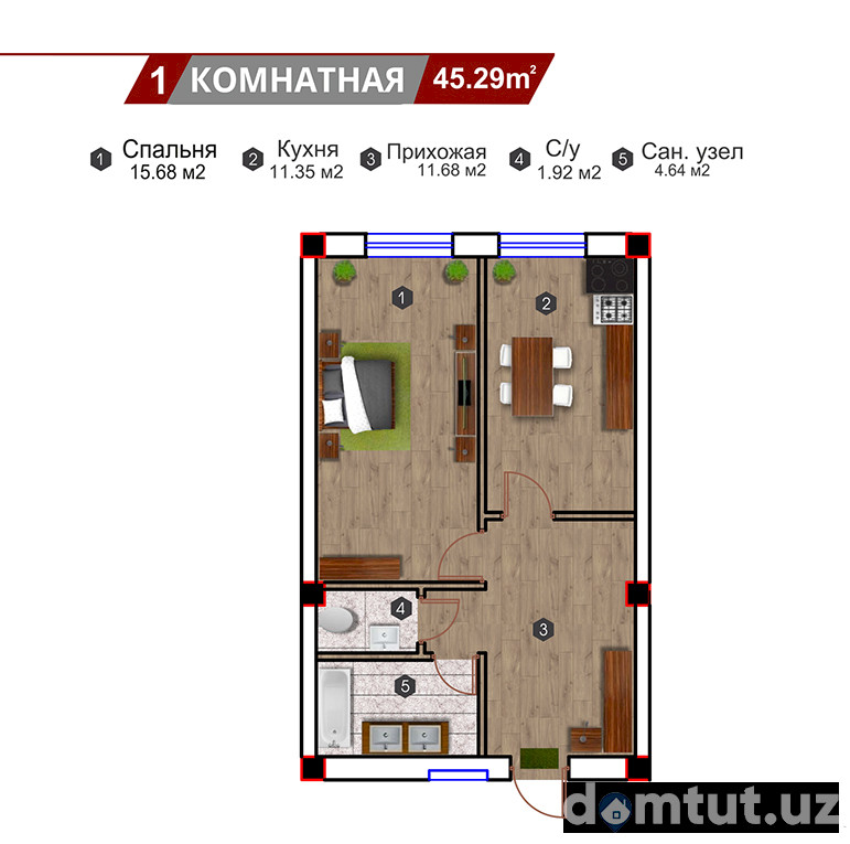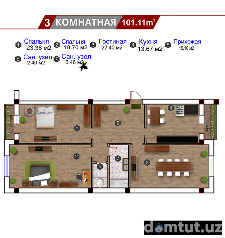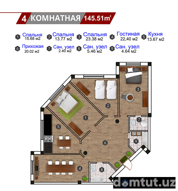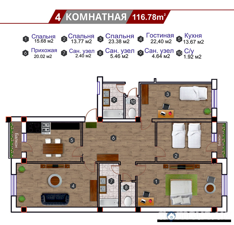 Majmuada maydoni 45 dan 116 kv.m. gacha bo’lgan bir, ikki, uch va to’rt xonali jami 270 ta kvartira taqdim qilingan. Shiftlar balandligi 3,1 metr. Tayyor turar-joylar suvoqdan chiqqan holda foydalanishga topshiriladi. Ularda kirish eshiklari, shishapaketli deraza bloklari o’rnatiladi, devor va shiftlarni bo’yashga tayyorlash ishlari bajariladi va pollar styajka qilinadi. Uy barcha muhandislik kommunikatsiyalariga ulangan holda foydalanishga topshiriladi.